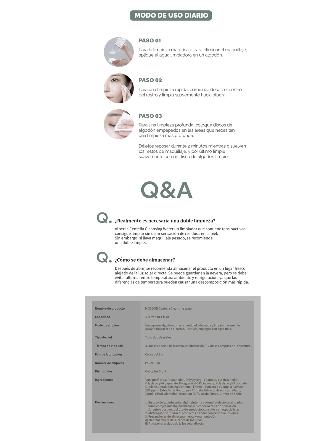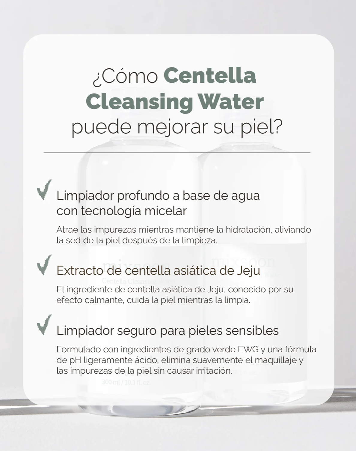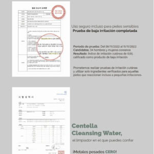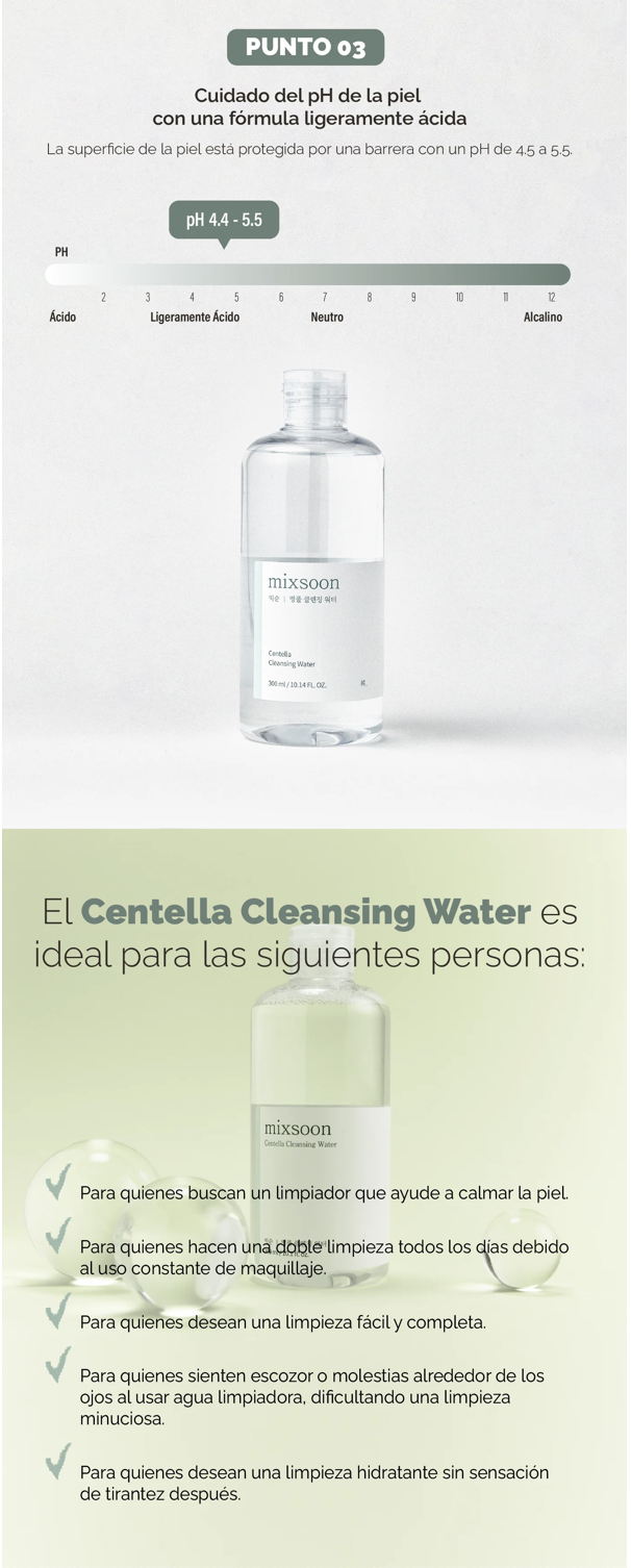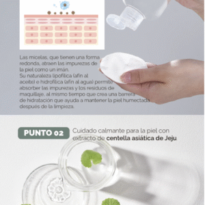 Agua micelar de Centella. Diseñada para limpiar la piel delicadamente, eliminando de forma eficaz la suciedad de impurezas sin causar irritación.