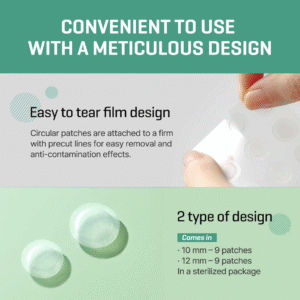 Parches transparentes hidrocoloides para granitos, que protegen la piel, reducen la inflamación y aceleran la curación del acné, evitando que las bacterias se propaguen o que toques la zona afectada. Son delgados, discretos y efectivos incluso bajo maquillaje.
