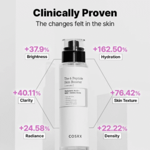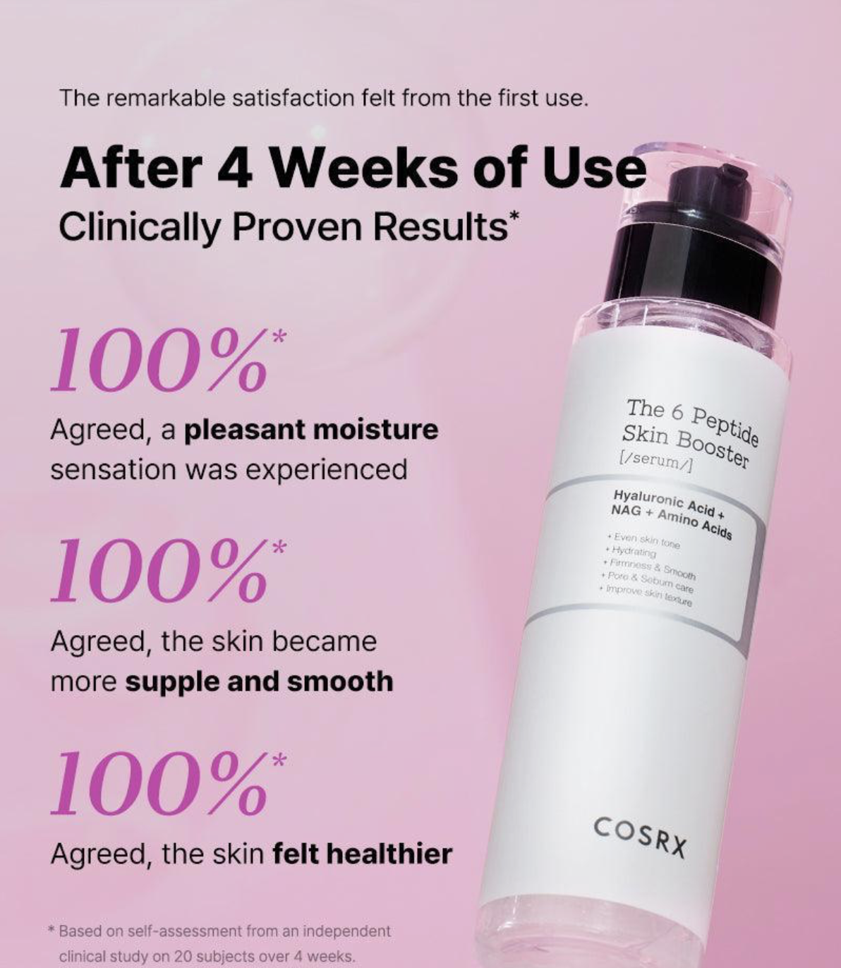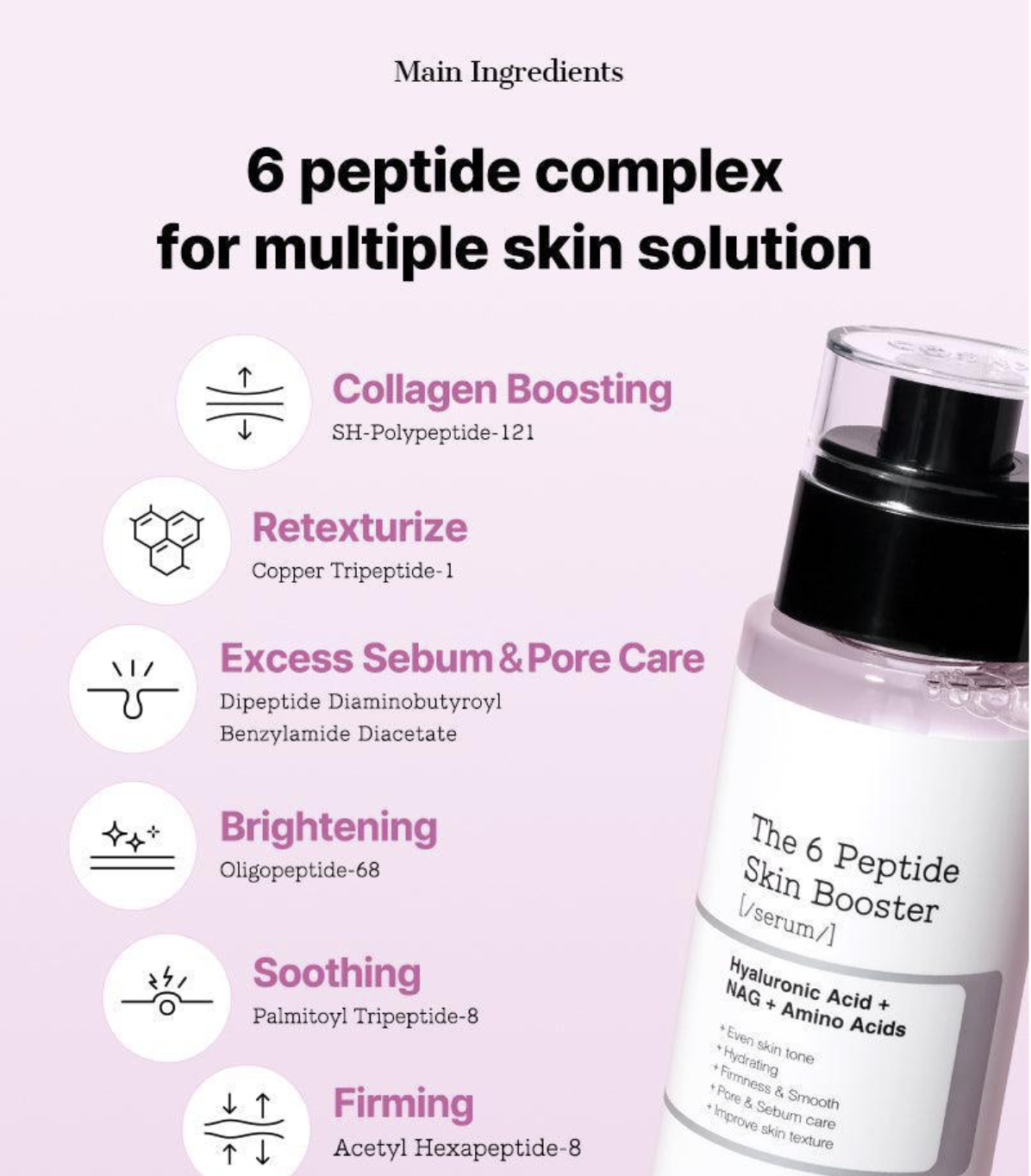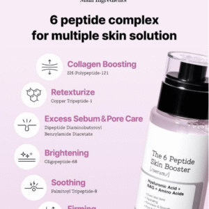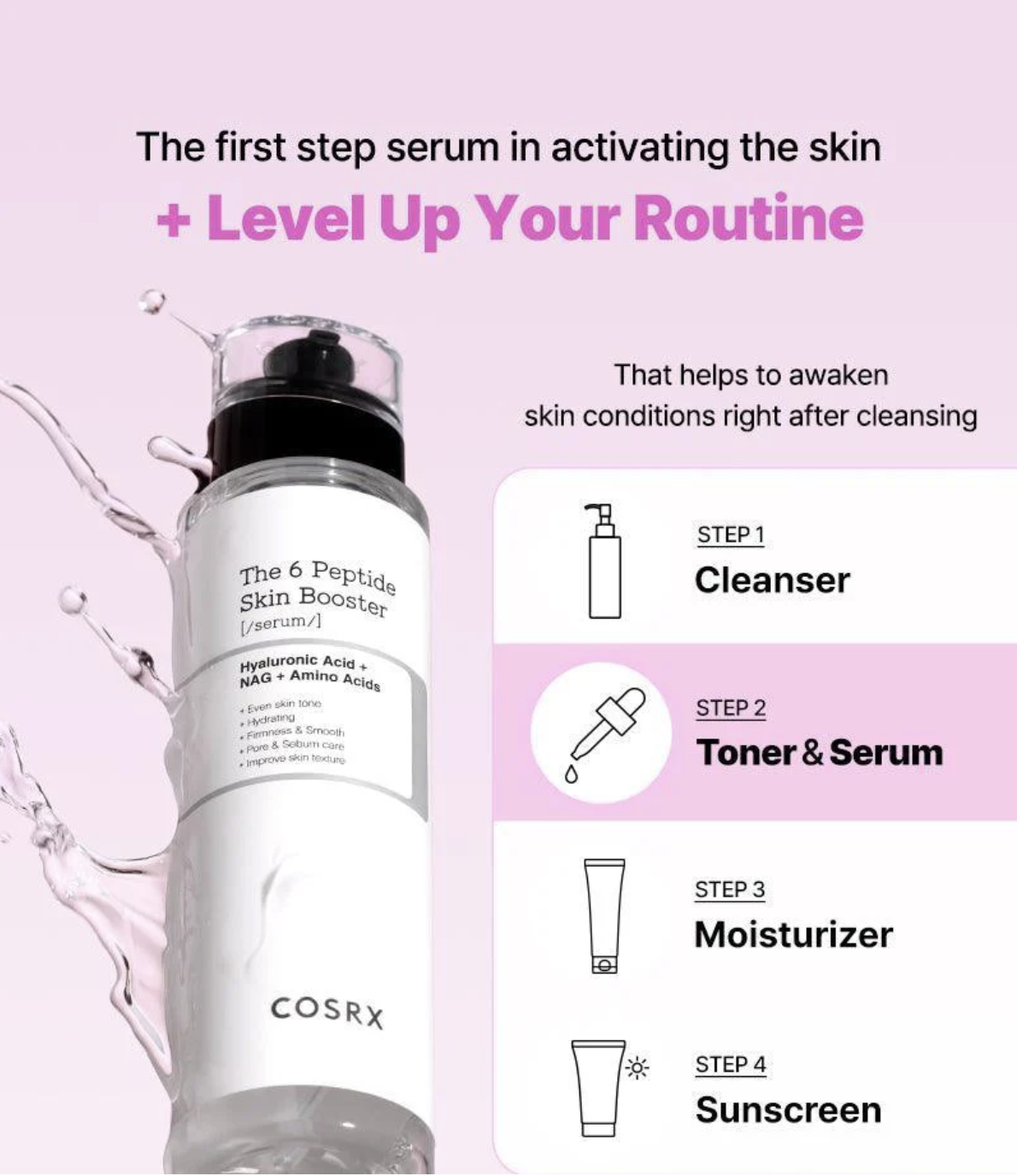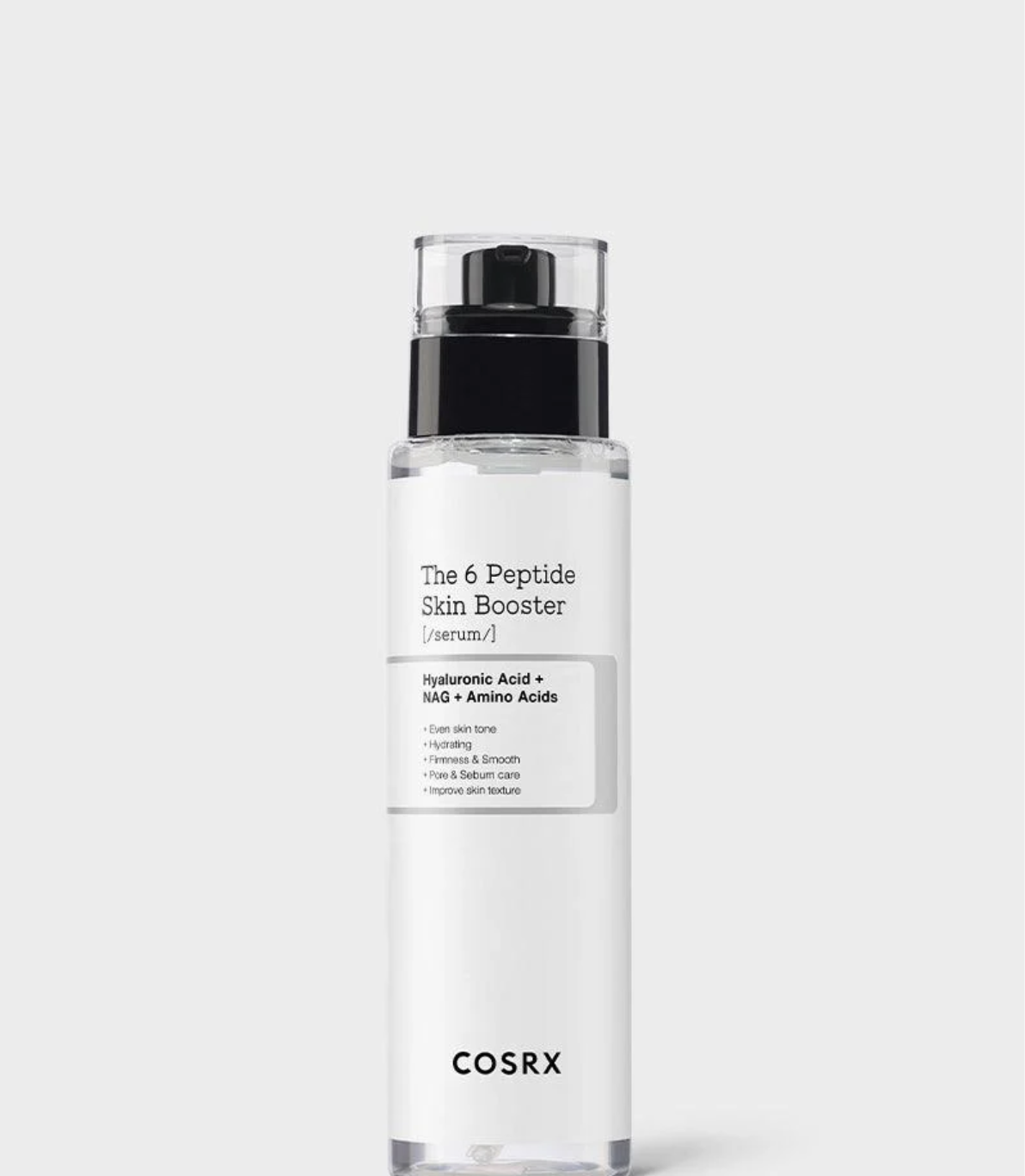 El 6 Peptide Skin Booster serum de COSRX contiene 6 multipéptidos que aumentan la condición general de la piel, como los poros y el sebo, la firmeza, las líneas finas, la textura de la piel, el tono de la piel y la calma. Es perfecto para usar como el primer paso de la rutina de cuidado de la piel para prepararse y aumentar. Tiene una textura ligera y no pegajosa como el tóner y es fácil de combinar con otros ingredientes activos y texturas.