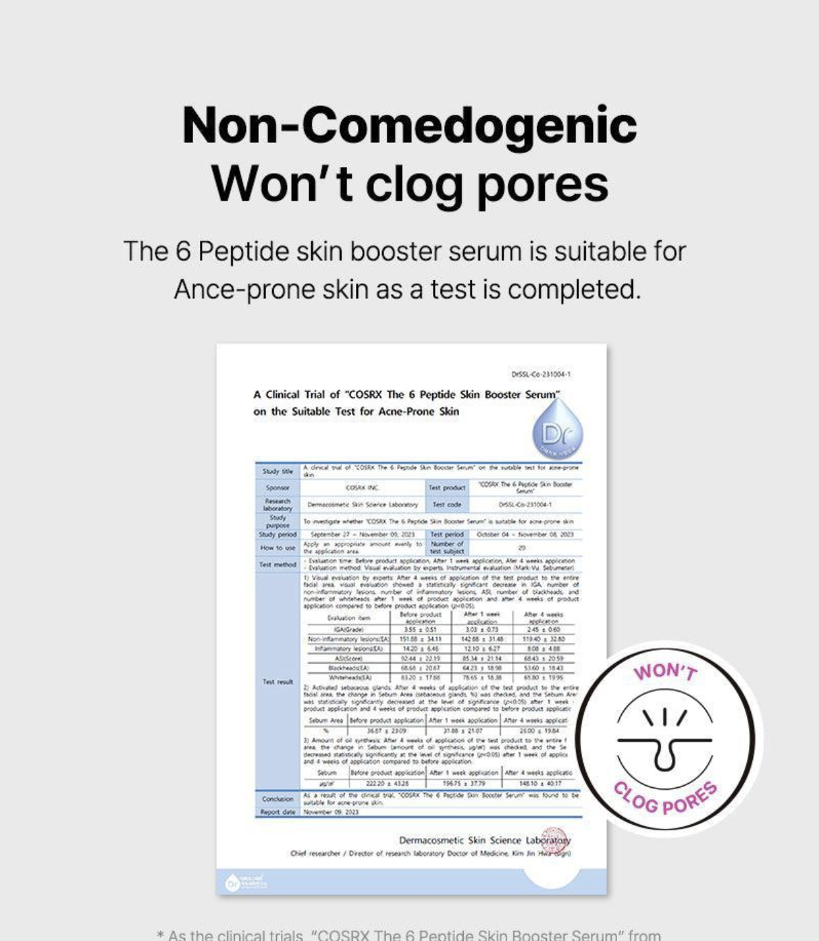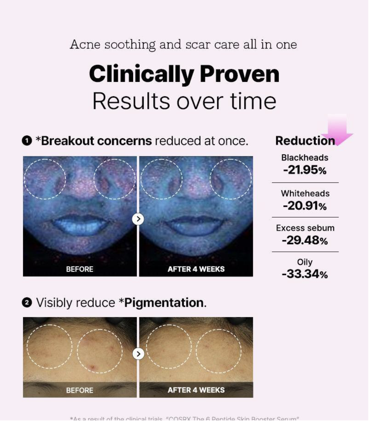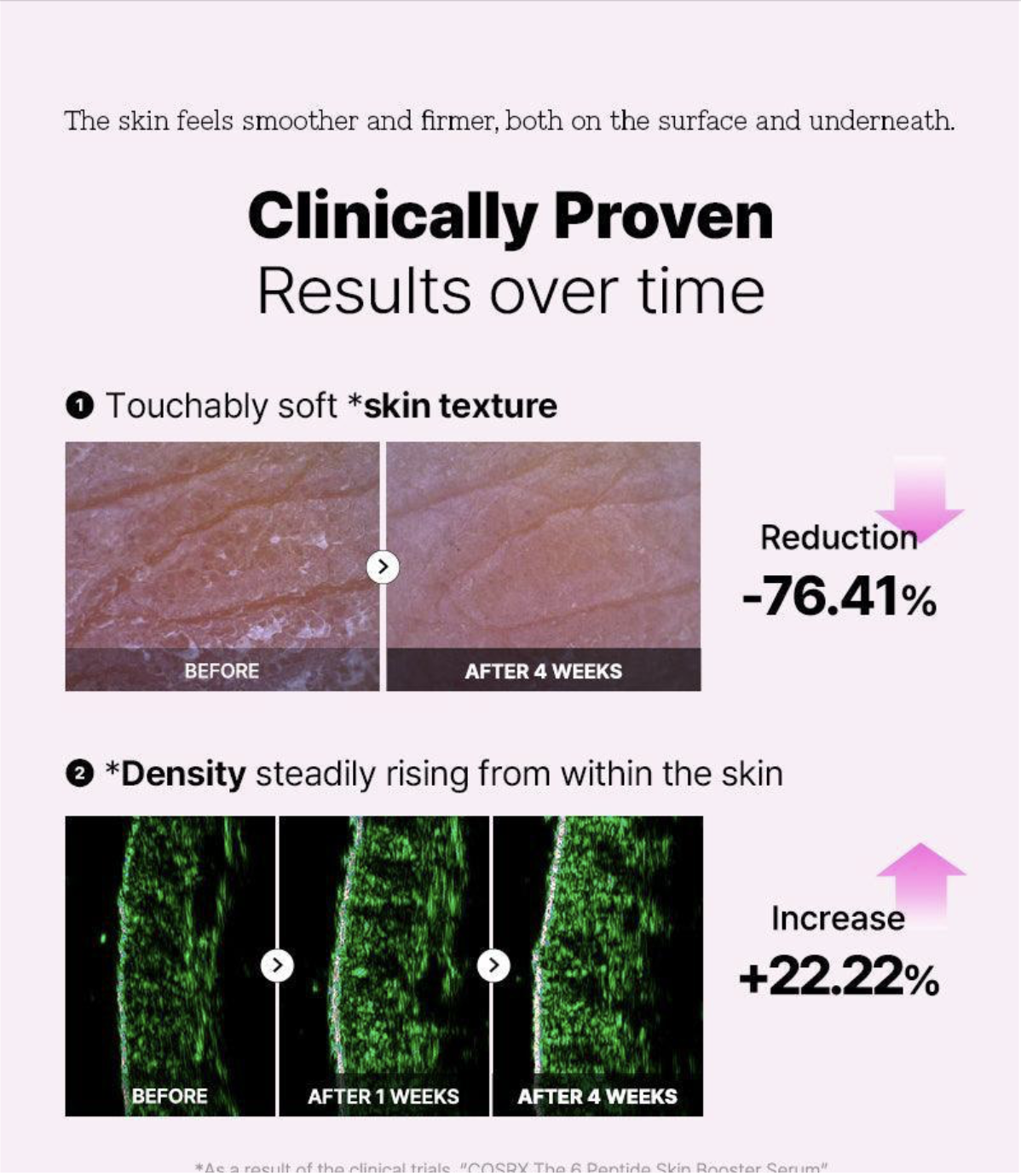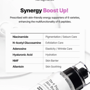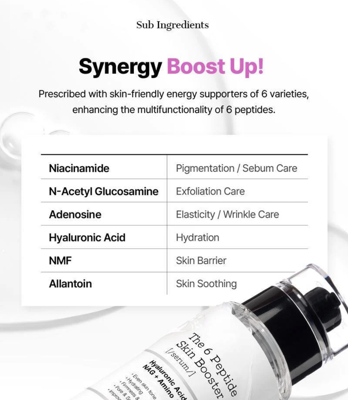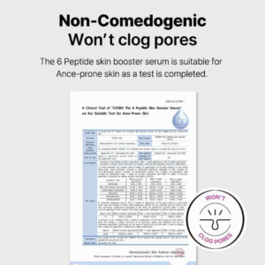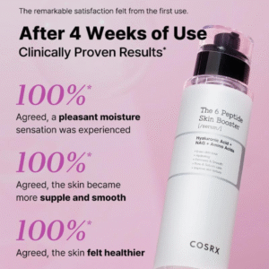 El 6 Peptide Skin Booster serum de COSRX contiene 6 multipéptidos que aumentan la condición general de la piel, como los poros y el sebo, la firmeza, las líneas finas, la textura de la piel, el tono de la piel y la calma. Es perfecto para usar como el primer paso de la rutina de cuidado de la piel para prepararse y aumentar. Tiene una textura ligera y no pegajosa como el tóner y es fácil de combinar con otros ingredientes activos y texturas.