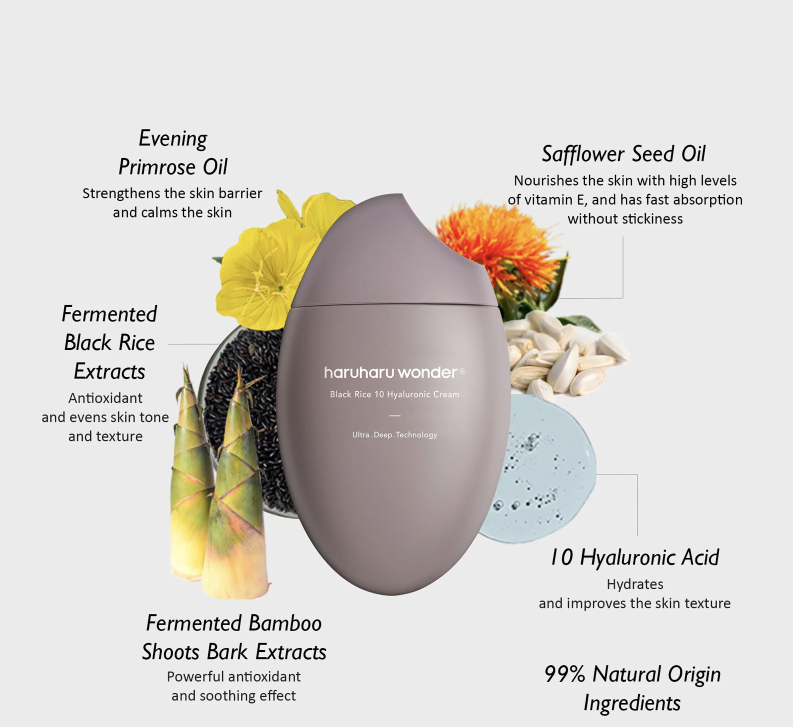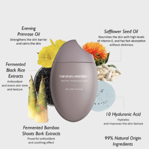 - 10.000 ppm de extracto de arroz negro coreano, ácido hialurónico y aceite de onagra, reafirman e hidratan la piel, promoviendo la regeneración celular para una apariencia más joven y luminosa.