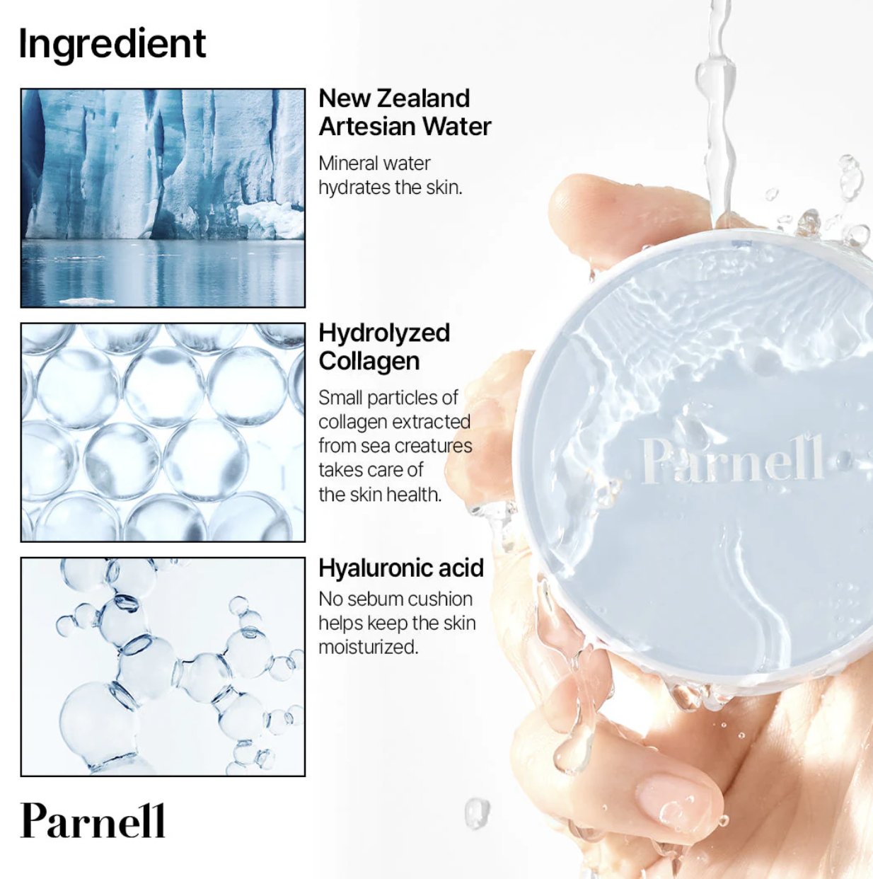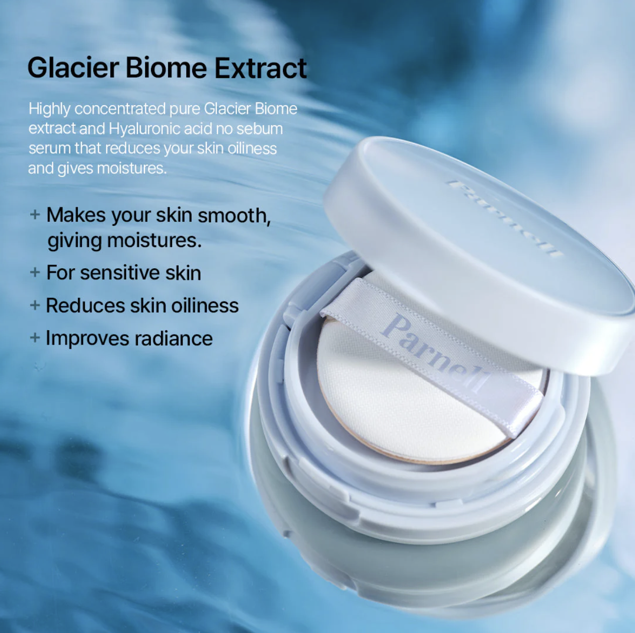El Glacial Biome Water No-Sebum Cushion de Parnell es la opción perfecta para quienes desean una piel sin brillo, fresca y con un aspecto uniforme durante todo el día. Su fórmula ligera tipo “second skin” ofrece cobertura media que corrige imperfecciones, enrojecimiento y poros visibles sin apelmazar ni oxidarse.