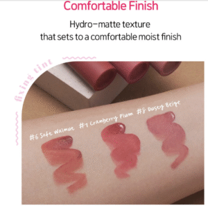 El Fixing Tint de la marca coreana ETUDE HOUSE se presenta en formato de 4 g con una fórmula “hydro-matte” que combina comodidad y alta adherencia. Su textura ofrece una sensación ligera (lightweight) y confortable, con pigmentos intensos de cobertura completa.