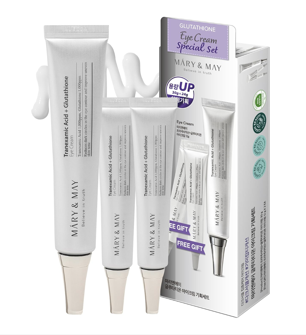 El Glutathione Eye Cream Special Set de Mary & May está diseñado para tratar ojeras, tono apagado y primeros signos de envejecimiento en el contorno de ojos. Su ingrediente estrella, el glutatión, es un potente antioxidante que ayuda a mejorar la luminosidad y a unificar el tono de la piel, contribuyendo a una mirada más fresca y descansada.