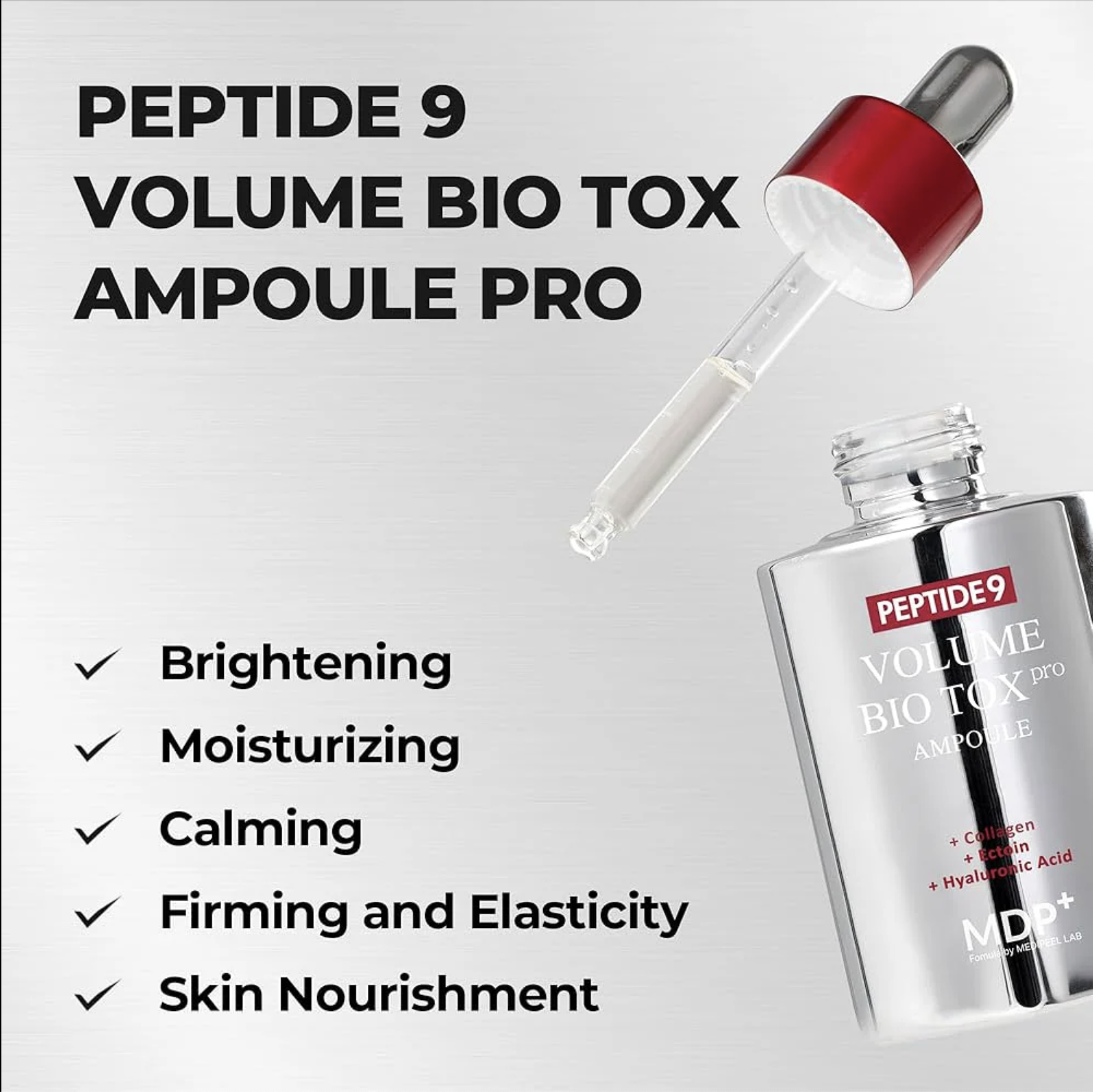 Peptide 9 Volume Biotox Ampoule Pro de MEDIPEEL es un suero de alta concentración formulado para tratar signos avanzados de envejecimiento como flacidez, arrugas marcadas y pérdida de densidad cutánea. Su fórmula se basa en un complejo de 9 péptidos biomiméticos, diseñados para apoyar la síntesis de colágeno y elastina, ayudando a mejorar la estructura y firmeza de la piel.