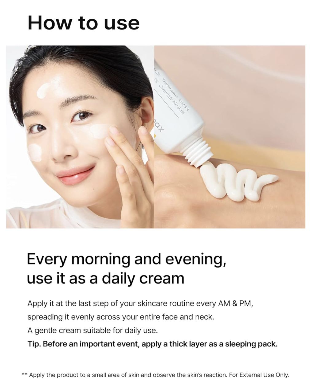 Aplicar una cantidad adecuada sobre la piel limpia, después del suero, mañana y noche.