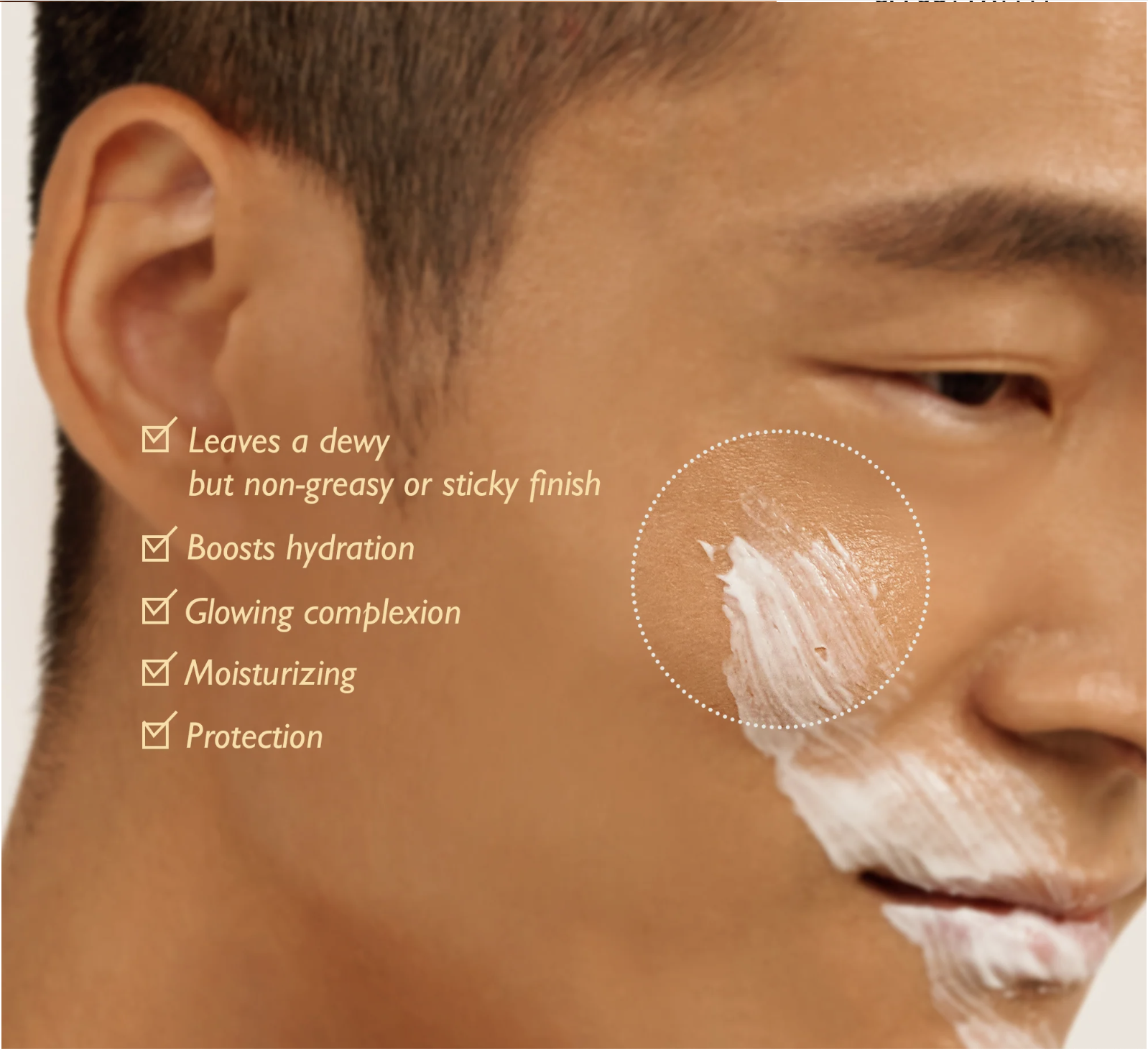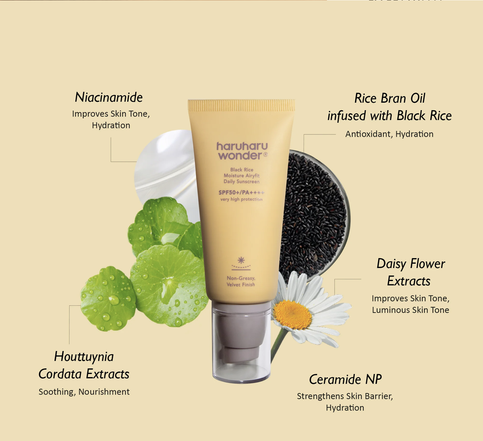 - Protector solar no graso con acabado aterciopelado, enriquecido con extracto de arroz negro rico en ácido hialurónico, que forma una barrera protectora que retiene la hidratación eficazmente.