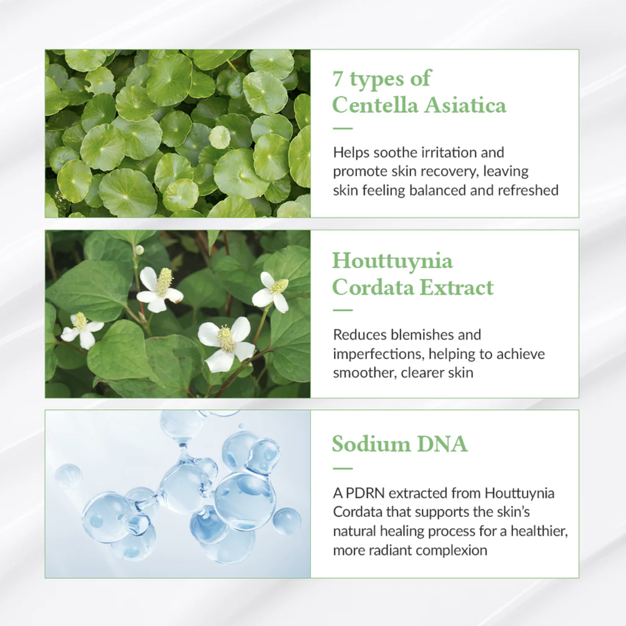 - Camellia Sinensis Leaf Water (té verde), múltiples extractos de Centella Asiatica, y Houttuynia Cordata: Antioxidantes, antiinflamatorios y ayudan a reducir rojeces.