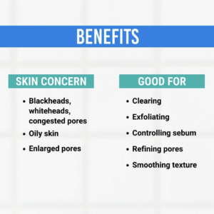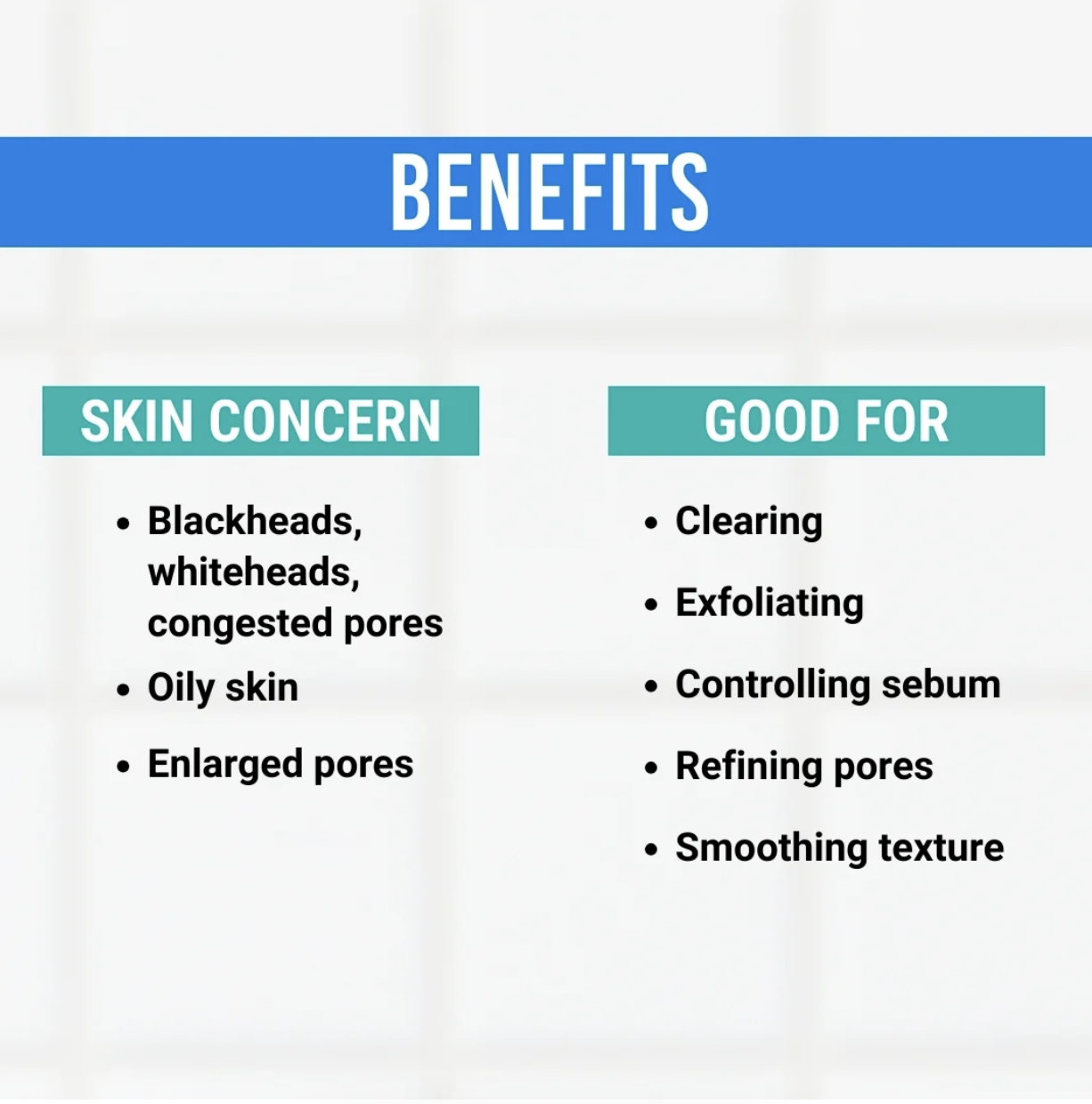 • Succinic Acid. Disuelve el sebo acumulado y suaviza los puntos negros.
